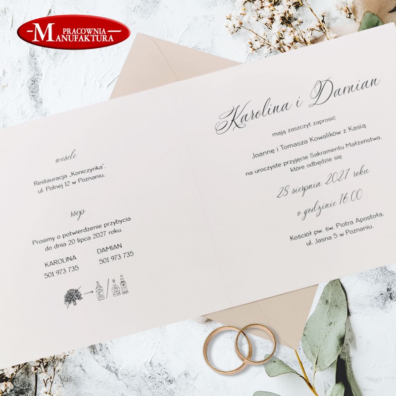 zaproszenie wykonane z kartonu w kolorze ivory - jasny krem,