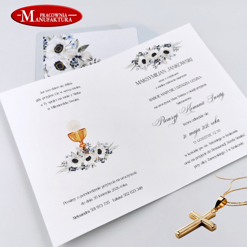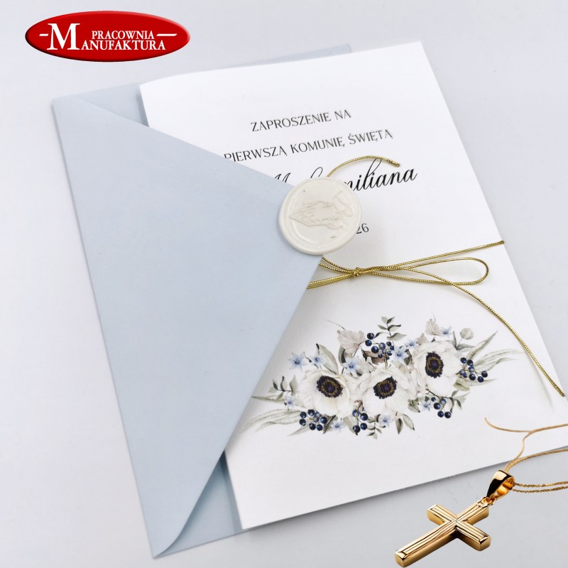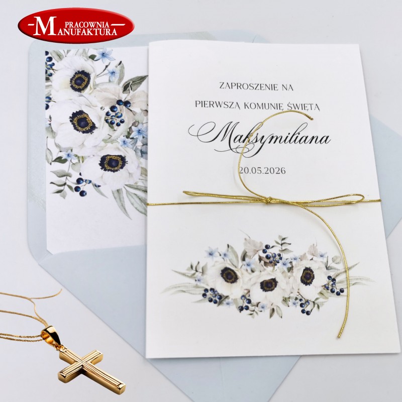 Subtelne zaproszenia na komunię, chrzest, niebieskie kwiaty