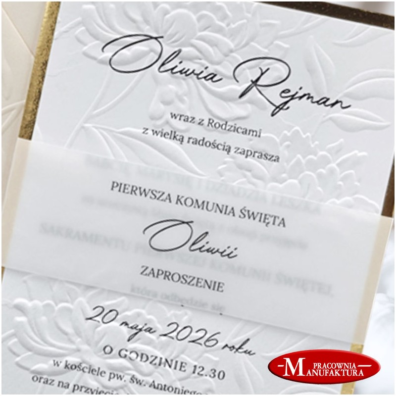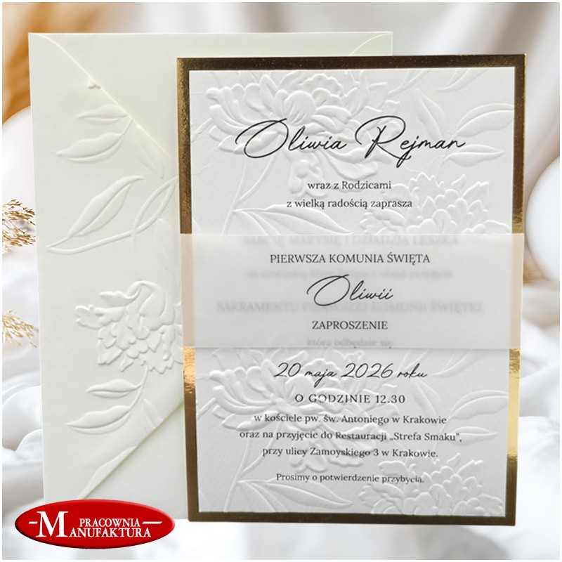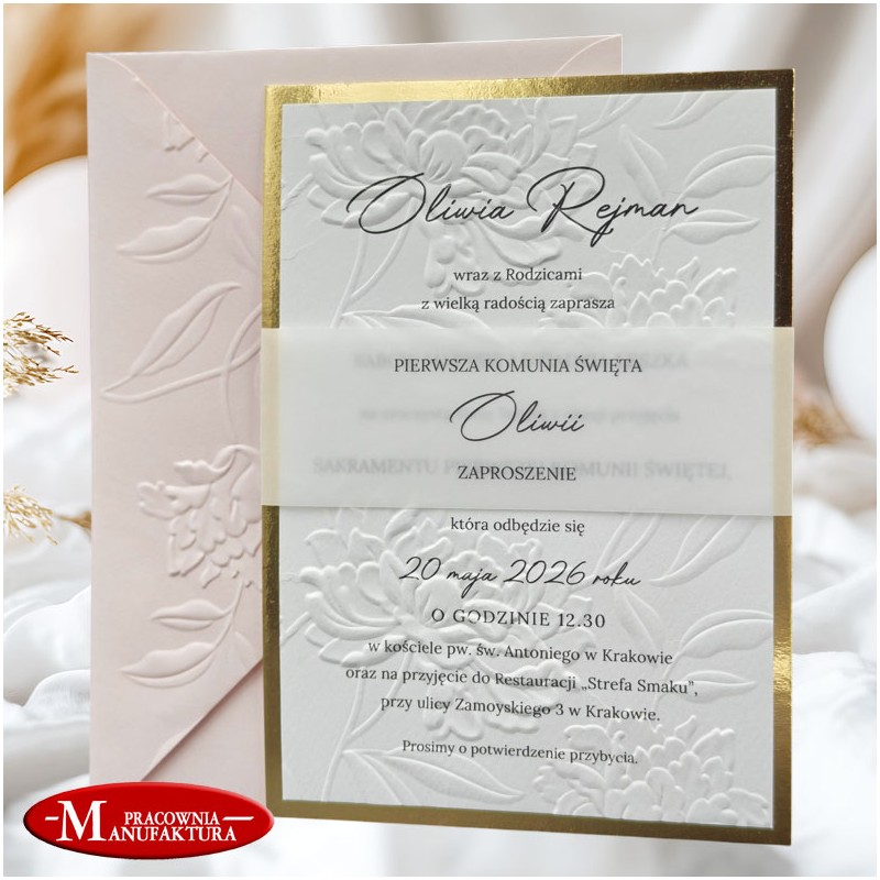 Zaproszenia z wytłoczonym motywem piwonii na komunię, chrzest