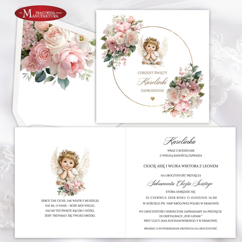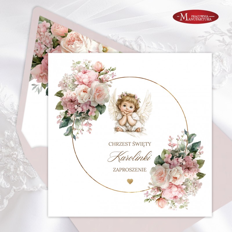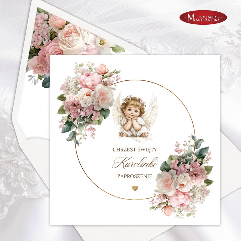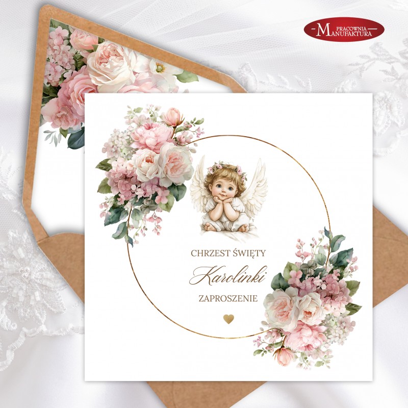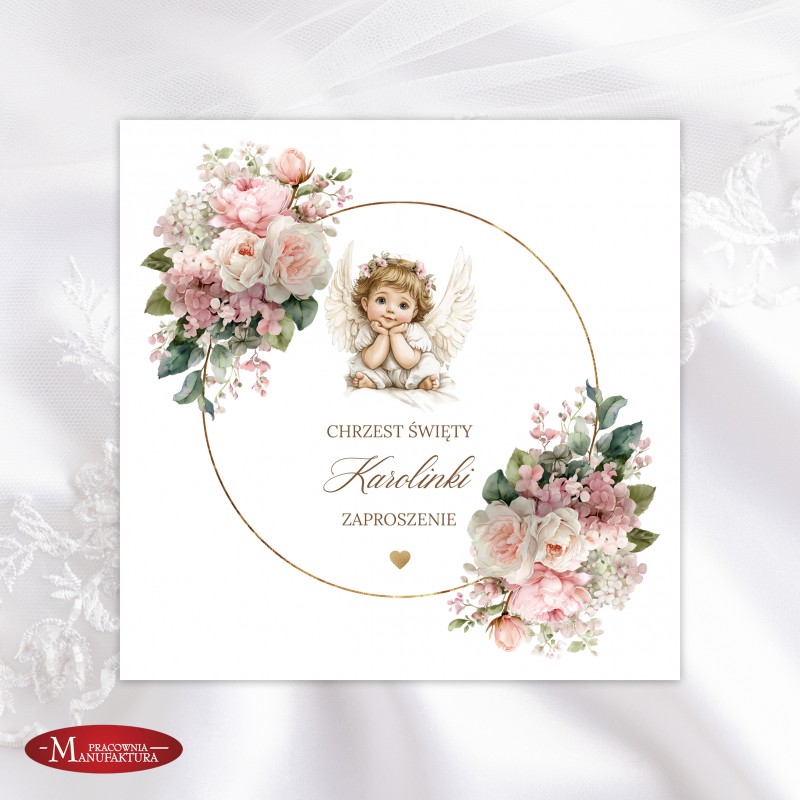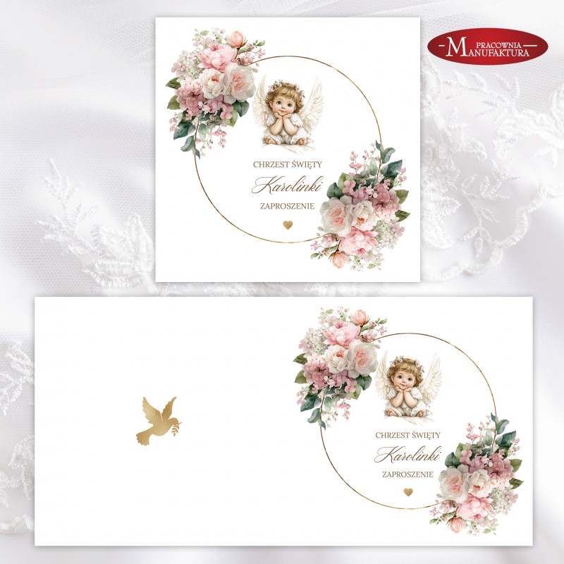 Urocze zaproszenia na chrzest z aniołkiem dla dla dziewczynki