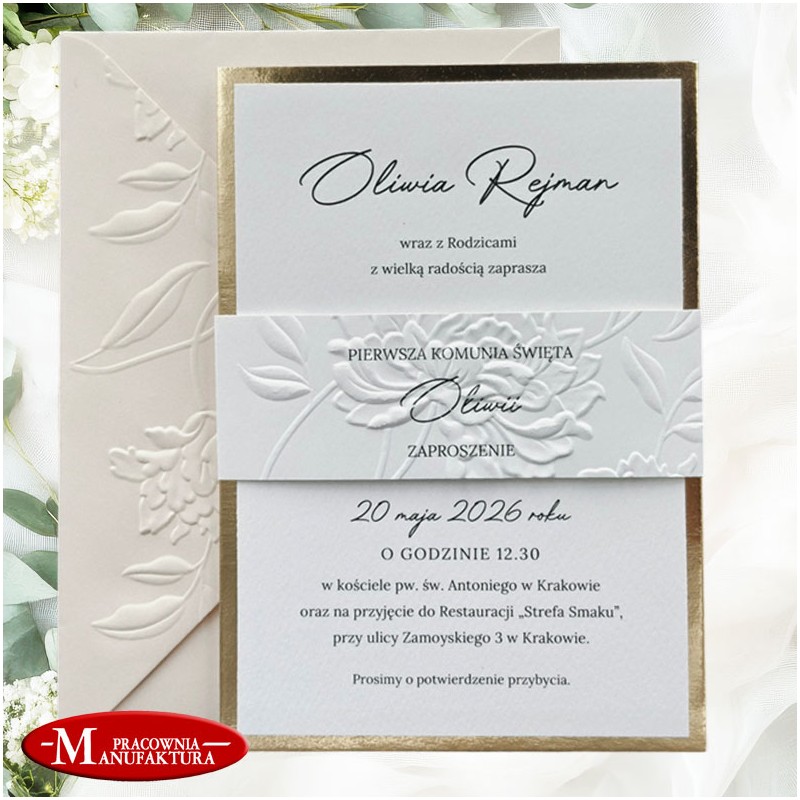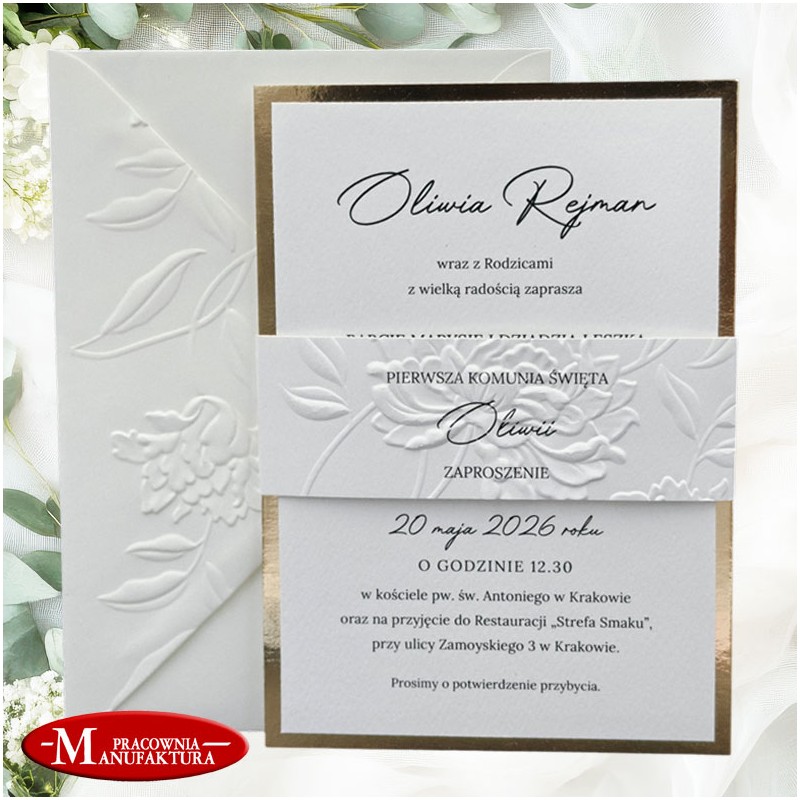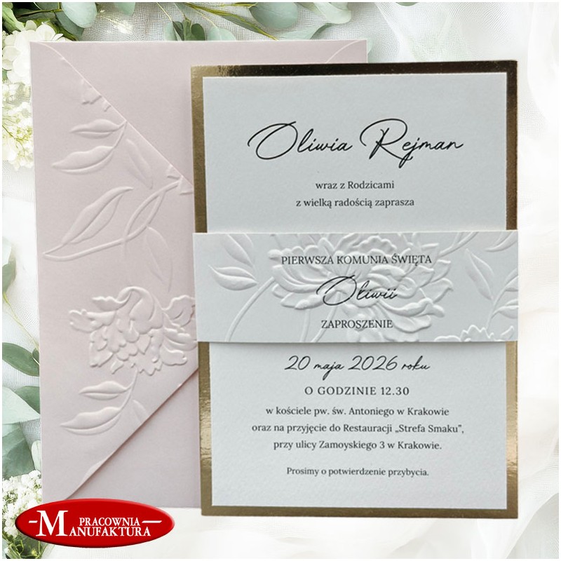 Zaproszenia z wytłoczonym motywem piwonii na komunię, chrzest